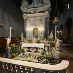 Sempre rimanendo all’interno molte sono le opere di rilievo conservate: una copia del polittico del XV secolo, l’altare maggiore situato in prossimità dell’abside centrale caratterizzata dalla presenza di tre monofore vitree decorate.