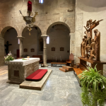 Sulla destra dell’altare molto bello il fonte battesimale in marmo del XV secolo la cui peculiarità artistica è rappresentata da una statua decorativa in bronzo.